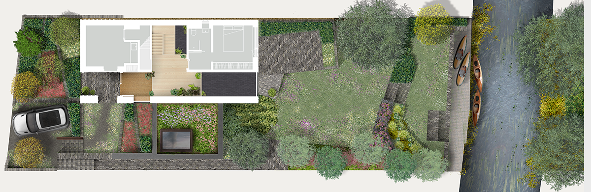 The garden uses a series of clustered semi-mature deciduous and evergreen trees, providing a strong visual connection front-to-back while screening and privacy from within the house and garden. The front garden has native woodland planting and snowdrops beneath the trees within the shaded terraces of the lower ground floor level. The side garden, which is elevated and south-west facing, forms a dry gravel garden with draught tolerant planting. Finally, the rear garden uses a mixture of raised ericaceous beds towards the house and, towards the river, planting which is tolerant of flooding, such as willows, which will be regularly coppiced and help visually to connect the rear of the garden to the wider landscape on the other side of the river.