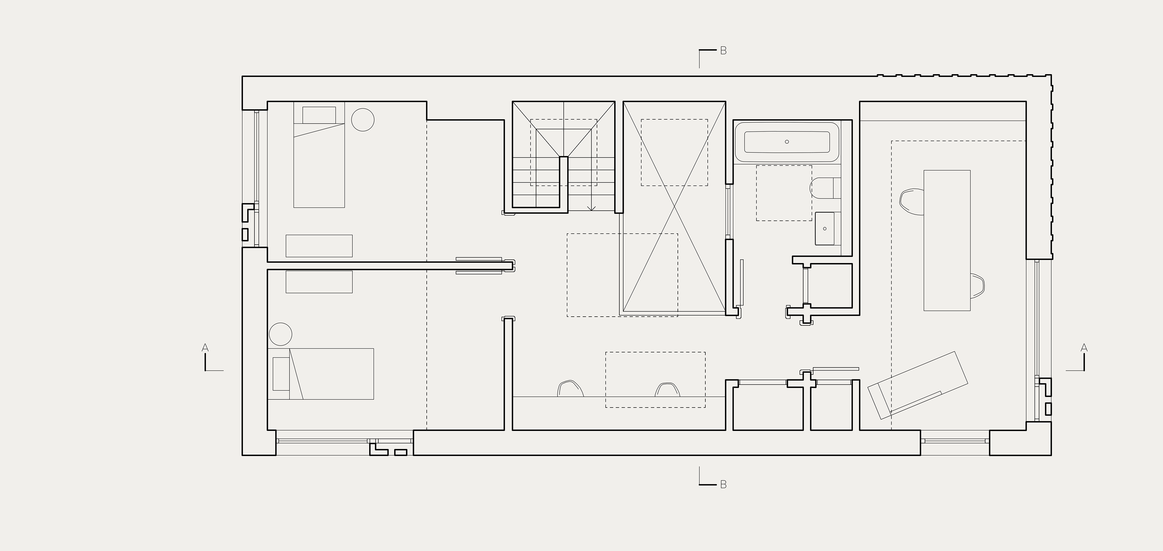 When you enter the lower ground floor the scale of the house becomes even more apparent, because below the garden, at the side of the house, lies a single storey pavilion with a family room with a generous 3m high ceiling. This single-storey building also contains services, storage and utility rooms, and has an intensive green roof.